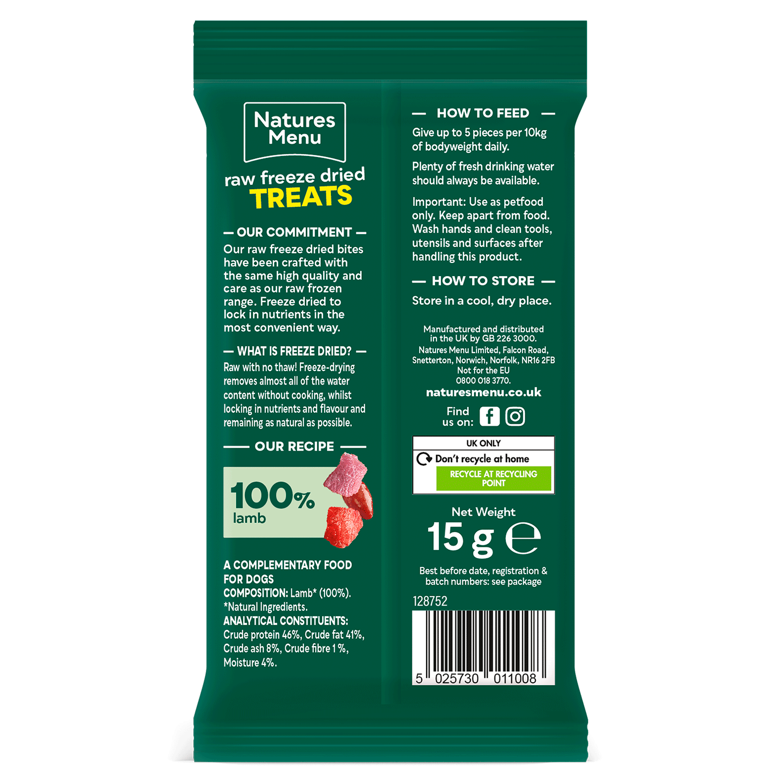 The ultimate reward for your dog, nothing but 100% quality Lamb freeze dried into bite-sized dog treats that are full of flavour. Freeze drying is an extremely gentle food process that preserves all the goodness, flavour and nutrients of the quality meat we use. The result is an incredibly nutritious treat that’s extra tasty, that dogs love. What’s more, Nature’s Variety Freeze Dried Bites can be enjoyed straight from the pack, with no refrigeration needed. Suitable for adult dogs and puppies alike. Comes in a convenient re-sealable pack.