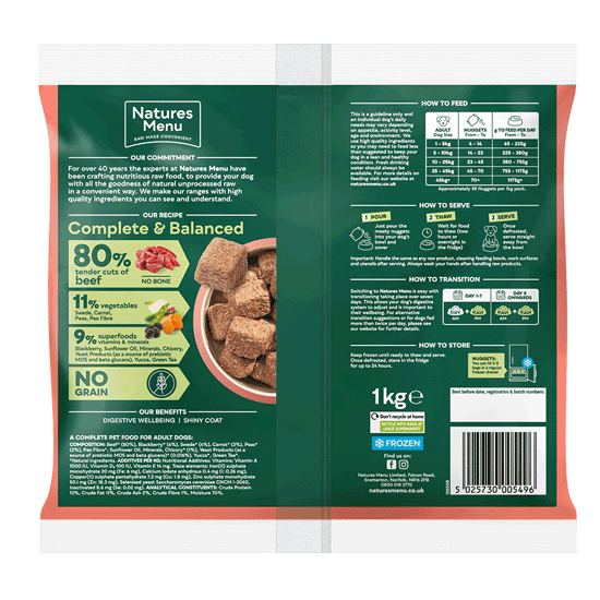 Treat your best friend to a complete, quality, dog beef food. At Natures Menu, our ranges are made in Norfolk with high-quality ingredients that you can see, understand and trust. Our tender cuts of beef raw dog food nuggets contain 80% beef and a nutritious blend of fruit and vegetable superfoods, so you can feed your dog a meal to bark about!
