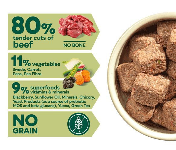 Delicious meaty nuggets made with 80% tender cuts of beef, blended with a nutritious combination of wholesome superfoods. Complete and balanced. Chicken free. No grain.