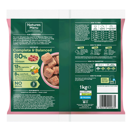 All the Natures Menu ranges are made in Norfolk with high-quality ingredients that you can see and understand, so by choosing Wild Venison dog food in this handy nugget format, you know you’re feeding them high quality food. Our recipes, crafted by our experts, are complete and balanced, and made to FEDIAF guidelines. This wild venison dog food is a no-grain recipe and may contain small pieces of bone (4g per 100g). It’s suitable for all adult dogs.