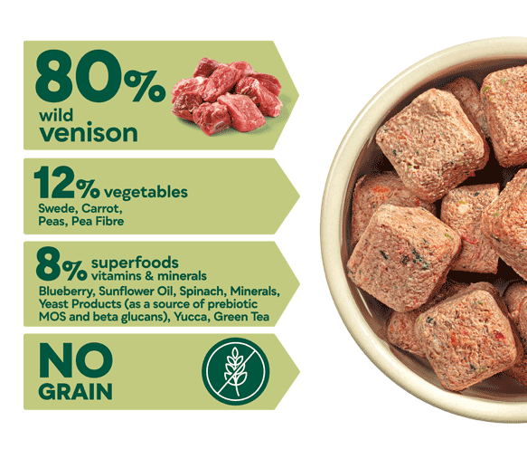 Superfoods aren’t just for humans! These complete and balanced, raw single protein nuggets are packed with 80% tender venison as well as specially selected fruits and vegetables. No grain. Chicken free. Pack size 1kg.