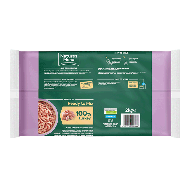 This raw turkey for dogs freeflow is an ingredient, not a complete meal. We suggest that our 'Ready to Mix' products are prepared with fruit, vegetables and healthy carbohydrates, such as brown rice. We also recommend adding a good quality vitamin and mineral supplement.