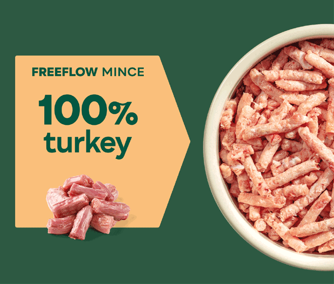 A delicious, nutritious, naturally lean protein, our raw freeflow turkey for dogs is the perfect ingredient to add to your dog’s home made meals.