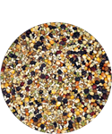 black maize 12%, bordeaux maize 3%, red maize 3%, premium cribs maize 4%, small cribs maize 4%, toasted soya beans 6%, maple peas 4%, small green peas 4%, tares 2%, mung beans 2%, white pigeon wheat 6%, white dari 12%, red dari 4%, safflower 12%, paddy rice 2%, broken rice 2%, peeled oats 2%, hempseed 3%, buckwheat 1%, canary seed 1%, yellow millet 1%, brown linseed 1%, rapeseed 1%, black coleseed 1%, thistle seed 1%, extruded Plus pellets 6% (soybean meal (dehulled), maize, wheat, spelt hulls, peas, (refined) vegetable (coconut and colza) oil, chalk, lucerne protein concentrate, elderberry 0,36%*, sodium bicarbonate, salt, algae (dried, schizochytrium) 0,03%, butyric acid salt 0,004%, glucosamine 0,002%, chondroitin sulphate 0,002%)