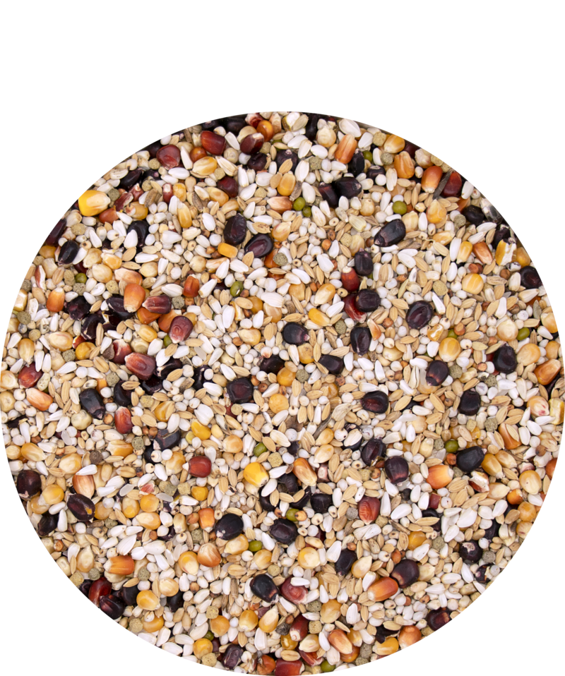 black maize 12%, bordeaux maize 4%, red maize 4%, small cribs maize 14%, mung beans 2%, white pigeon wheat 4%, white dari 16%, red dari 4%, safflower 16%, paddy rice 12%, broken rice 4%, peeled oats 2%, buckwheat 1%, brown linseed 1%, thistle seed 1%, extruded Plus pellets 3% (soybean meal (dehulled), maize, wheat, spelt hulls, peas, (refined) vegetable (coconut and colza) oil, chalk, lucerne protein concentrate, elderberry 0,18%*, sodium bicarbonate, salt, algae (dried, schizochytrium) 0,03%, butyric acid salt 0,004%, glucosamine 0,002%, chondroitin sulphate 0,002%)