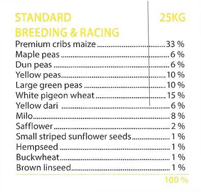 Premium cribs maize 33%, Maple peas 6%, Dun peas 6%, Yellow peas 10%, Large green peas 10%, White pigeon wheat 15%, Yellow dari 6%, Milo 8%, Safflower 2%, Small striped sunflower seeds 1%, Hempseed 1%, Buckwheat 1%, Brown linseed 1%