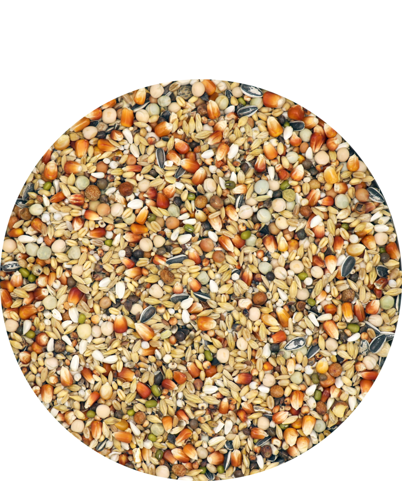 Red maize 22%, Small Cribs maize 2%, Maple peas 4%, Dun peas 8%, Yellow peas 9%, Large green peas 3%, Tares 3%, Mung beans 1.5%, White pigeon wheat 12%, White dari 4%, Red dari 4%, Safflower 3%, Pigeon barley 10%, Paddy rice 2.5%, Broken rice 1%, Peeled oats 1%, Small striped sunflower seeds 1%, Hempseed 1.5%, Buckwheat 1%, Canary seed 1%, Yellow millet 1.5%, Brown linseed 1.5%, Black coleseed 1.5%, Black caraway seed 1%